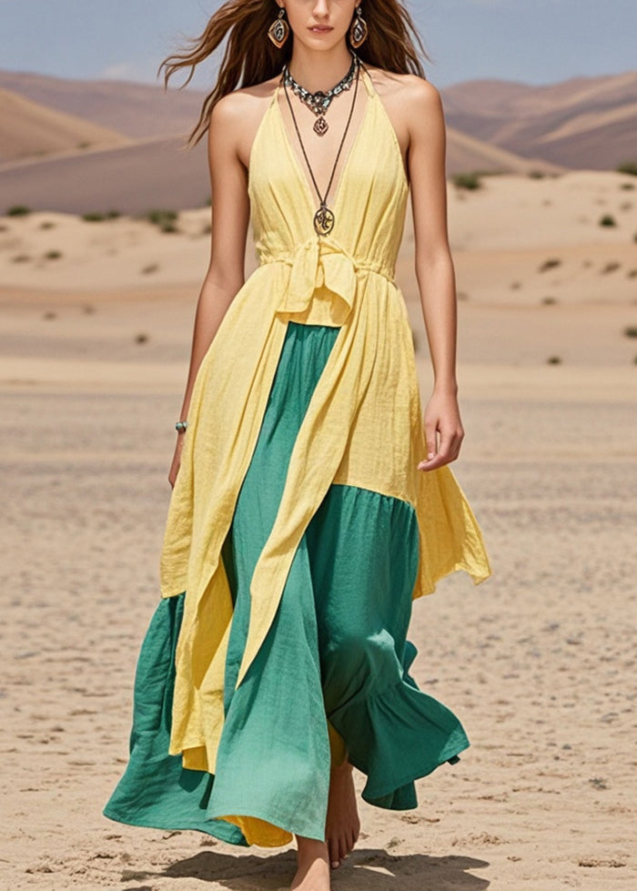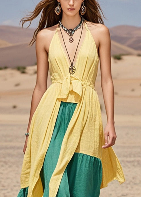 Fine Yellow Asymmetrical Patchwork Cotton Halter Dresses Summer