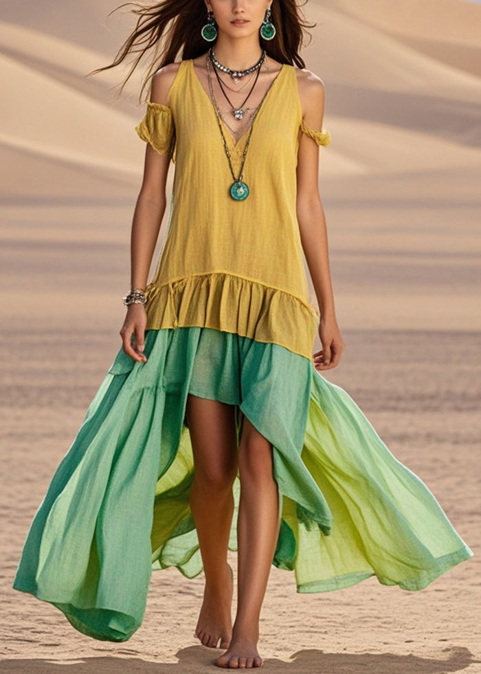 Yellow Patchwork Cotton Maxi Dresses Cold Shoulder Asymmetrical Design Summer