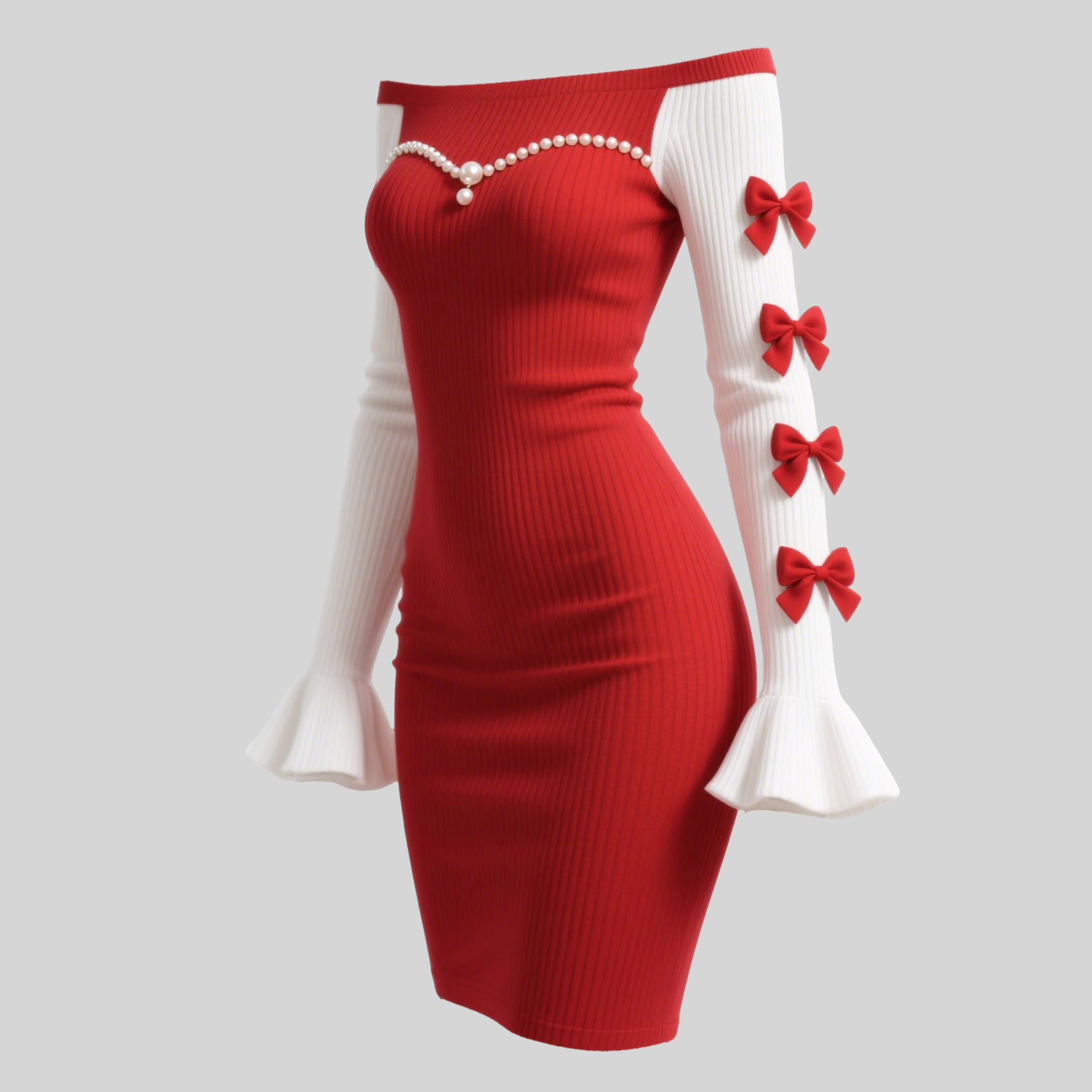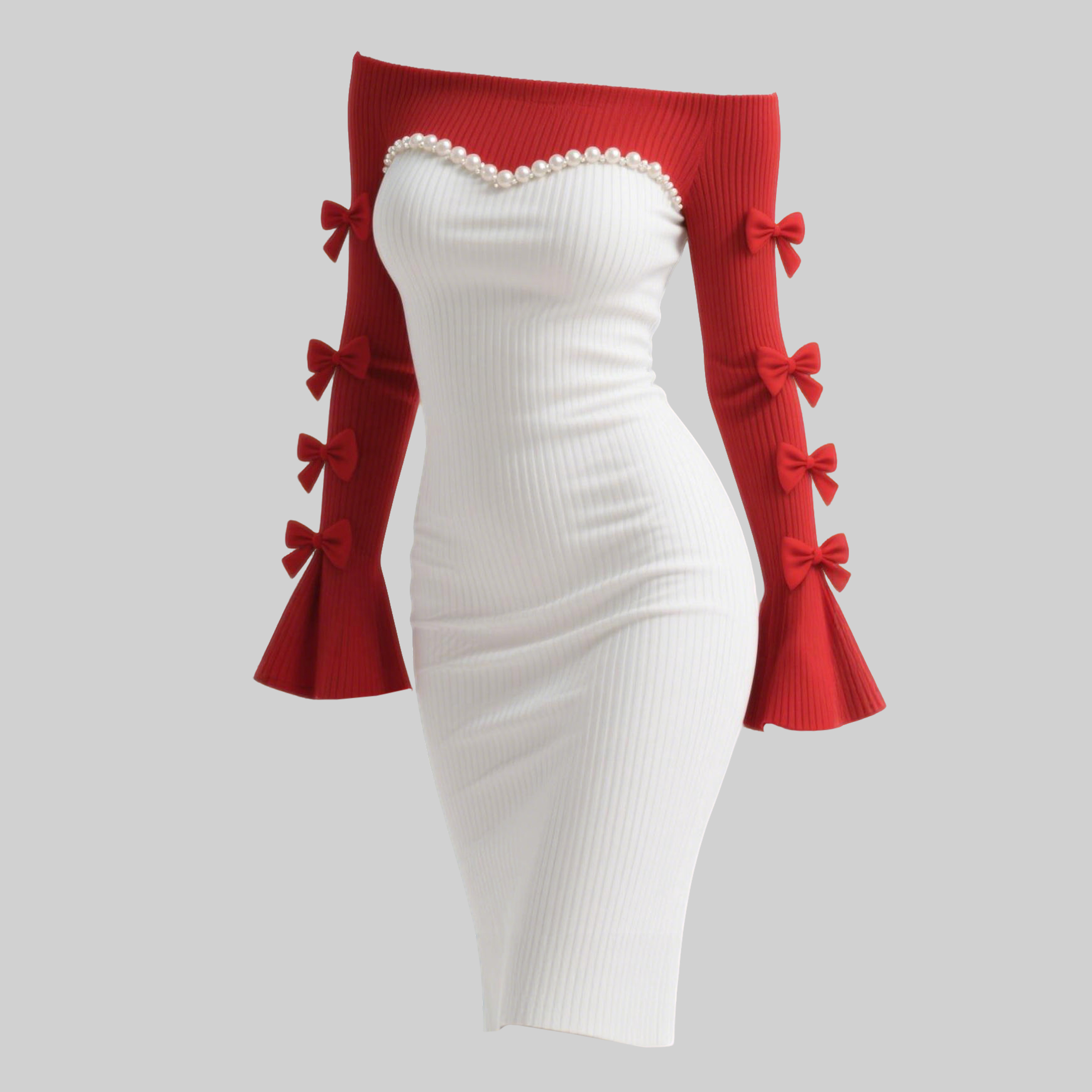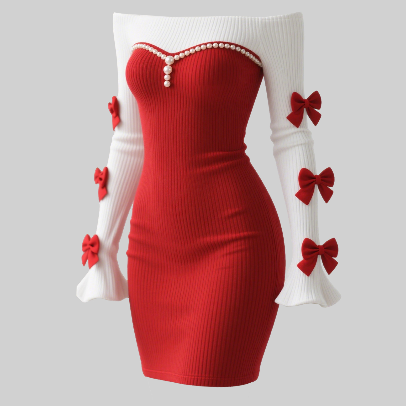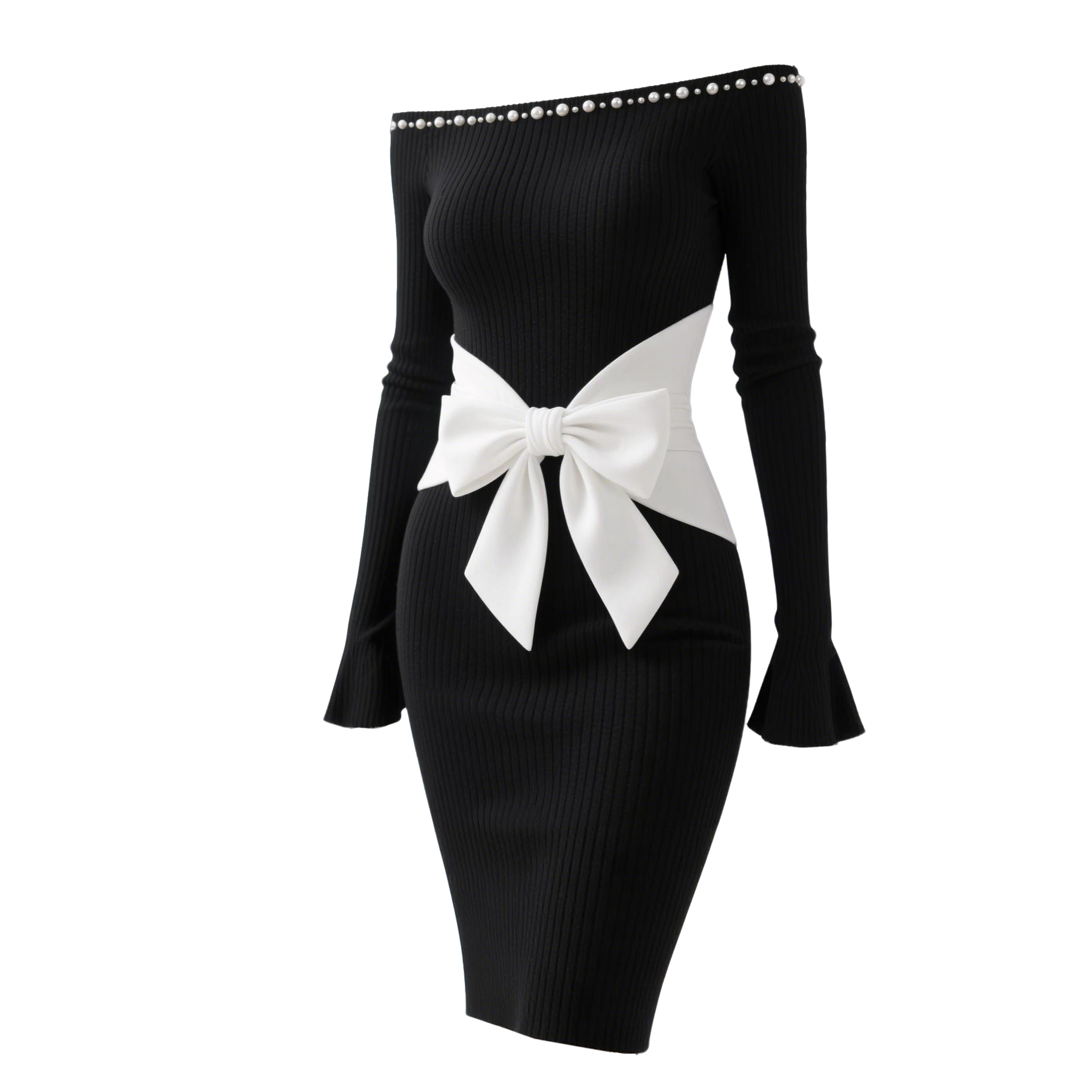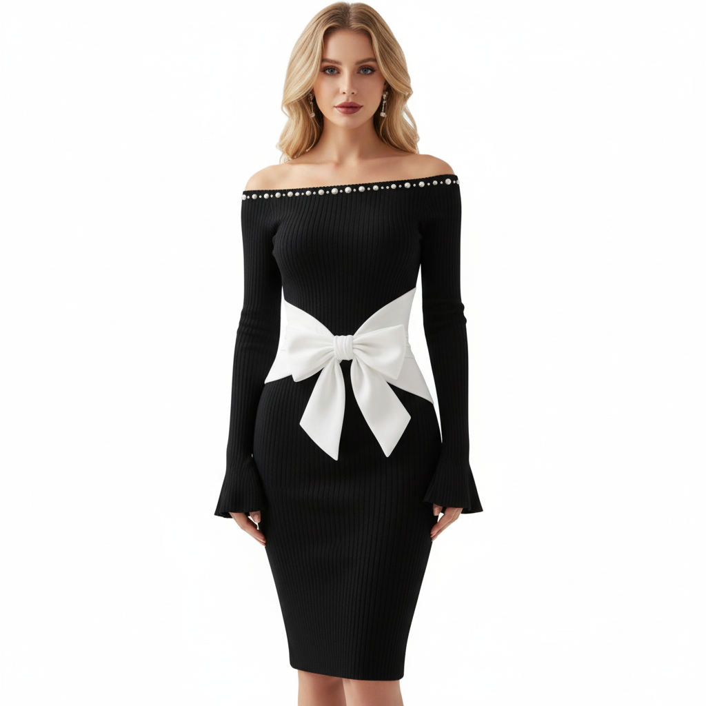 Women's Color-blocked Fitted Off-shoulder Dress With Bow And Pearl Embellishments, Sexy Flared Sleeves