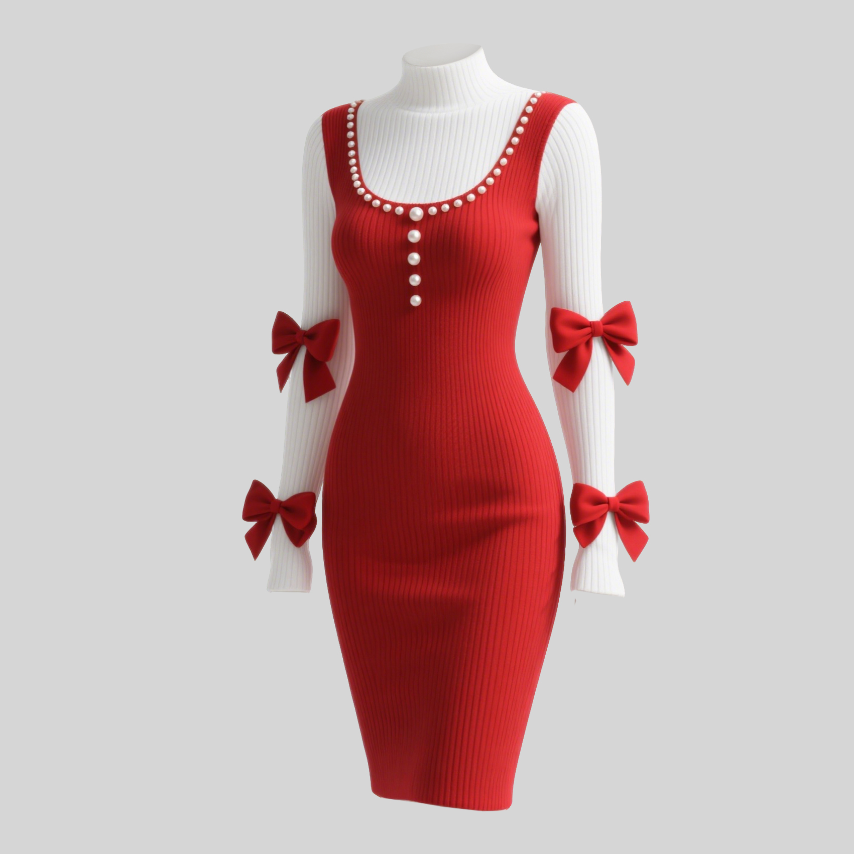 Women's Color-blocked Fitted High-neck Dress With Bow And Pearl Embellishments, Sexy Flared Sleeves