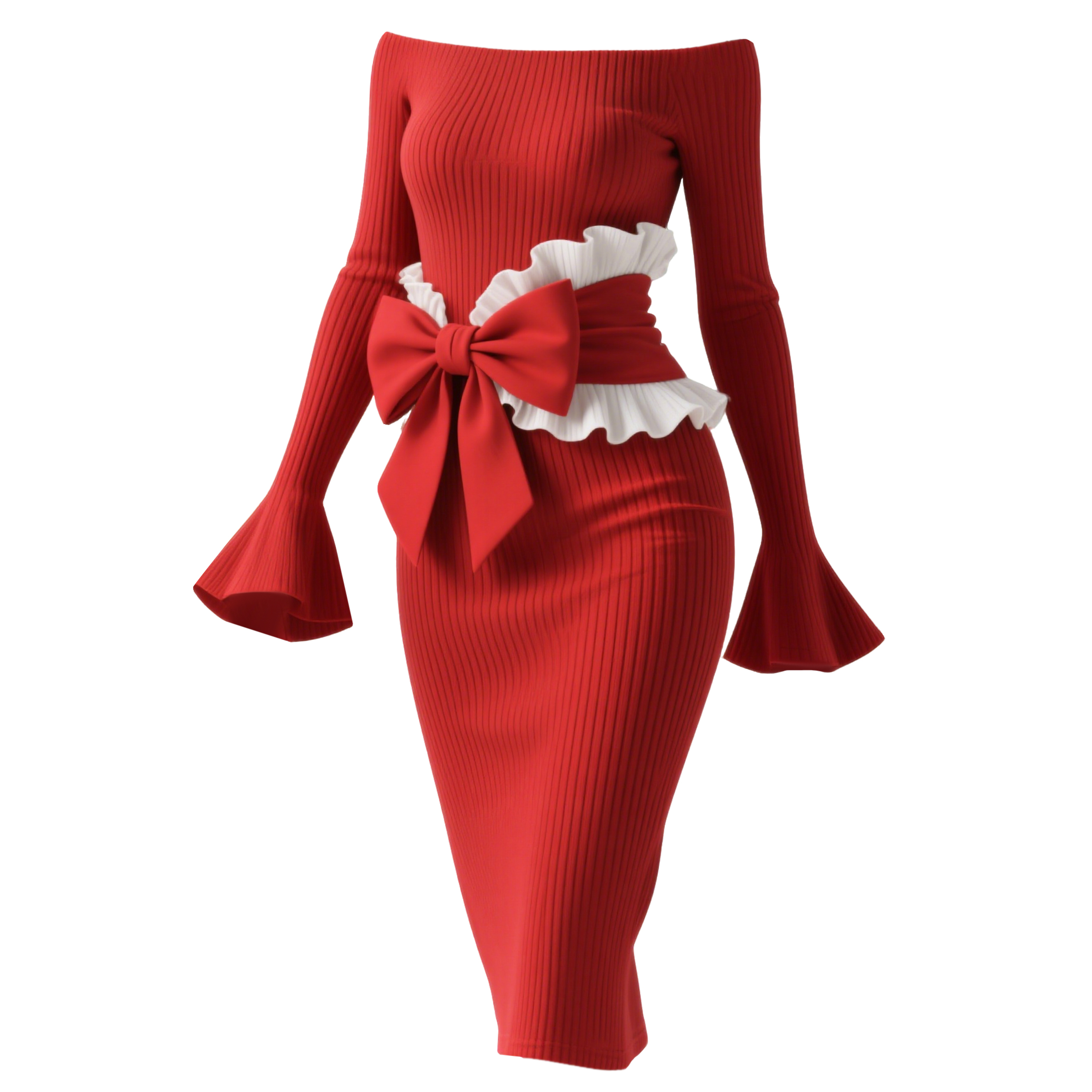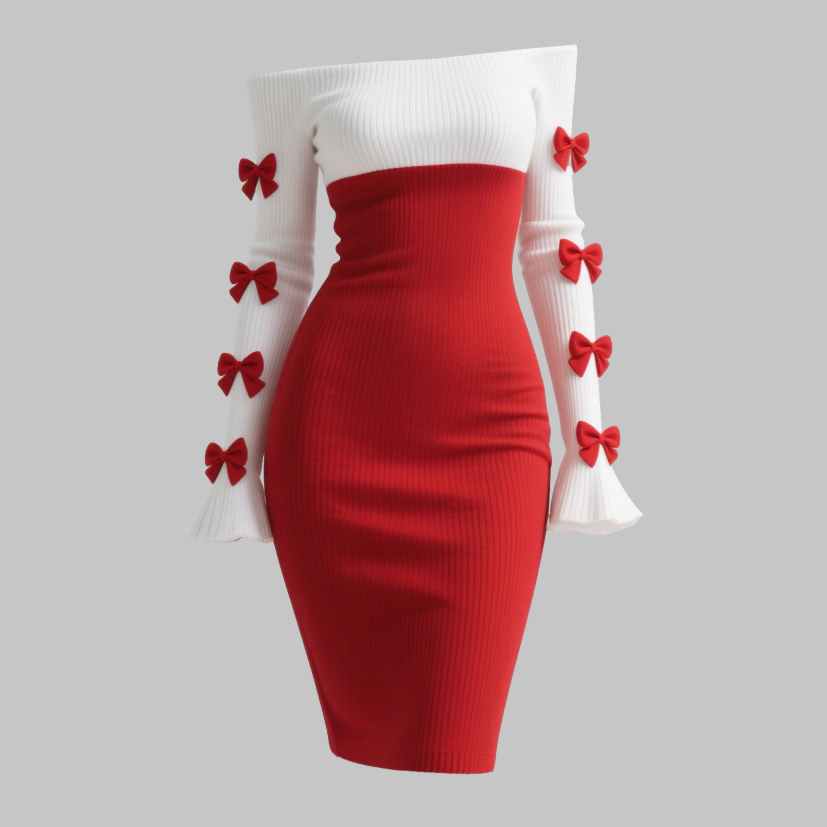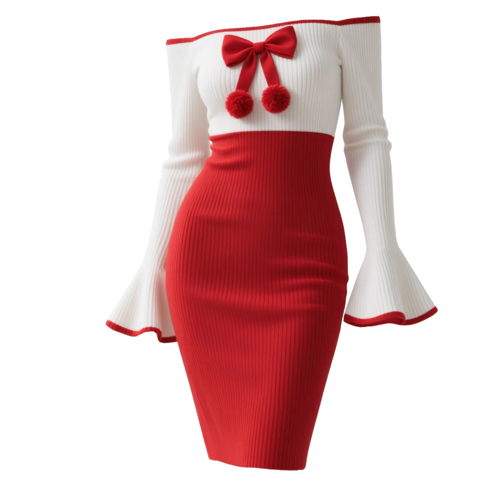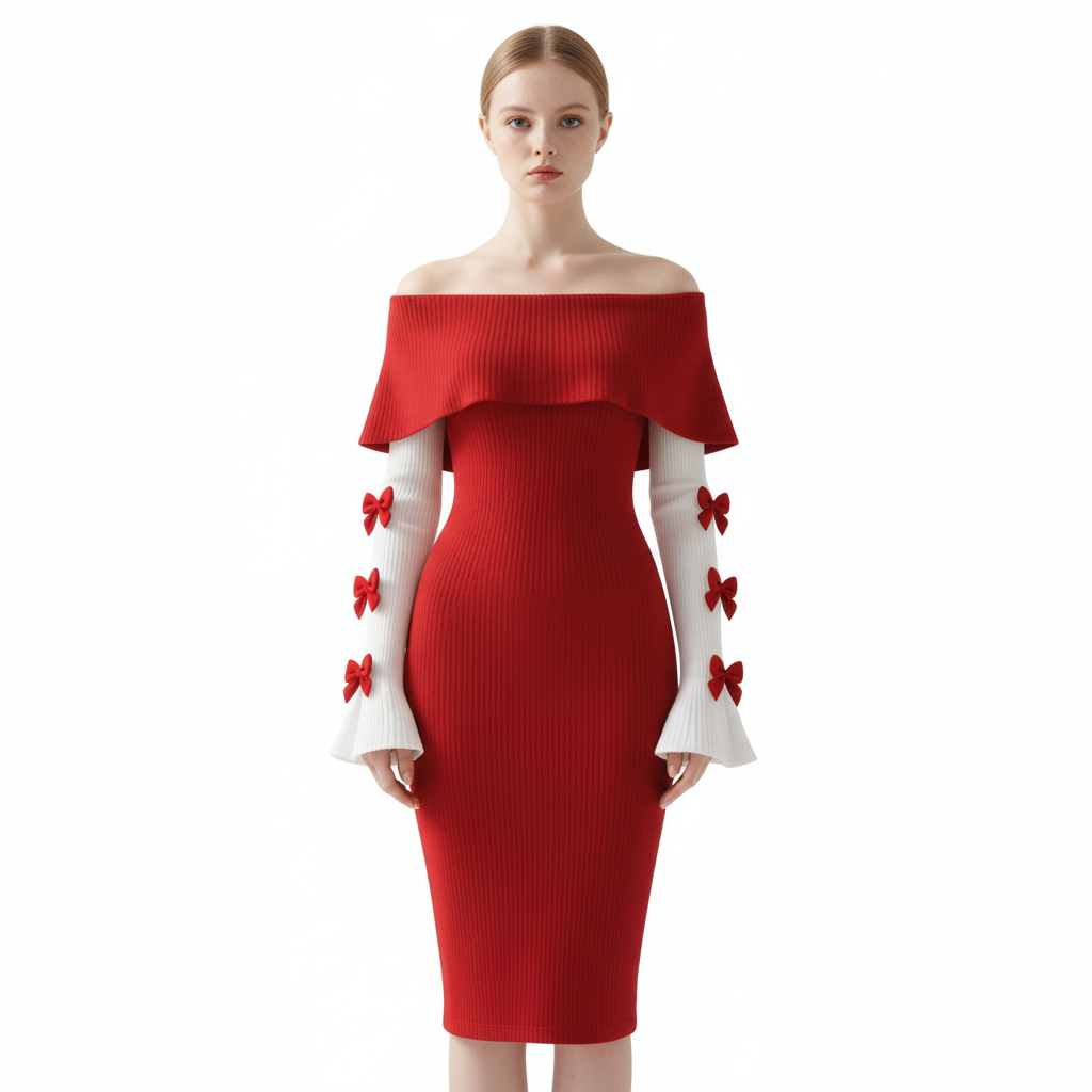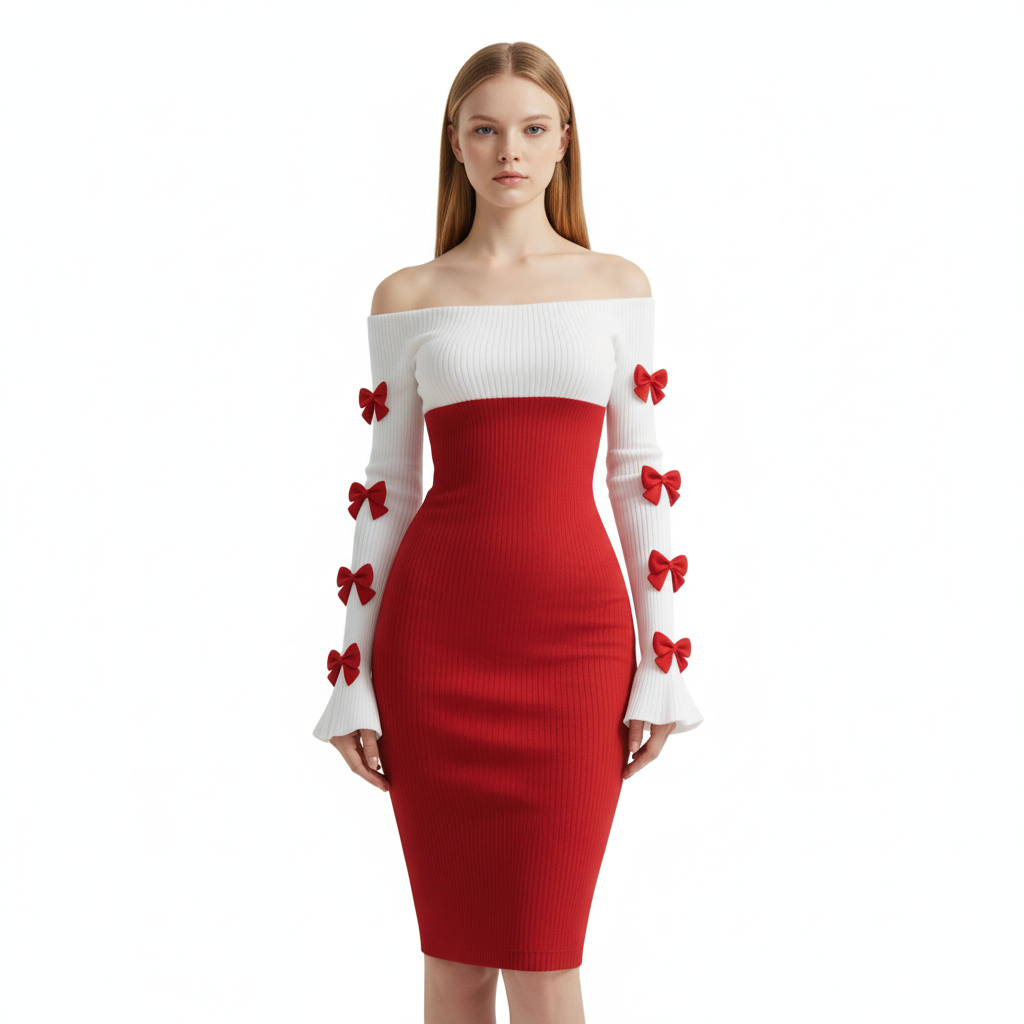 Women's Color-blocked Fitted Off-shoulder Dress With Bow Embellishment, Sexy Flared Sleeves