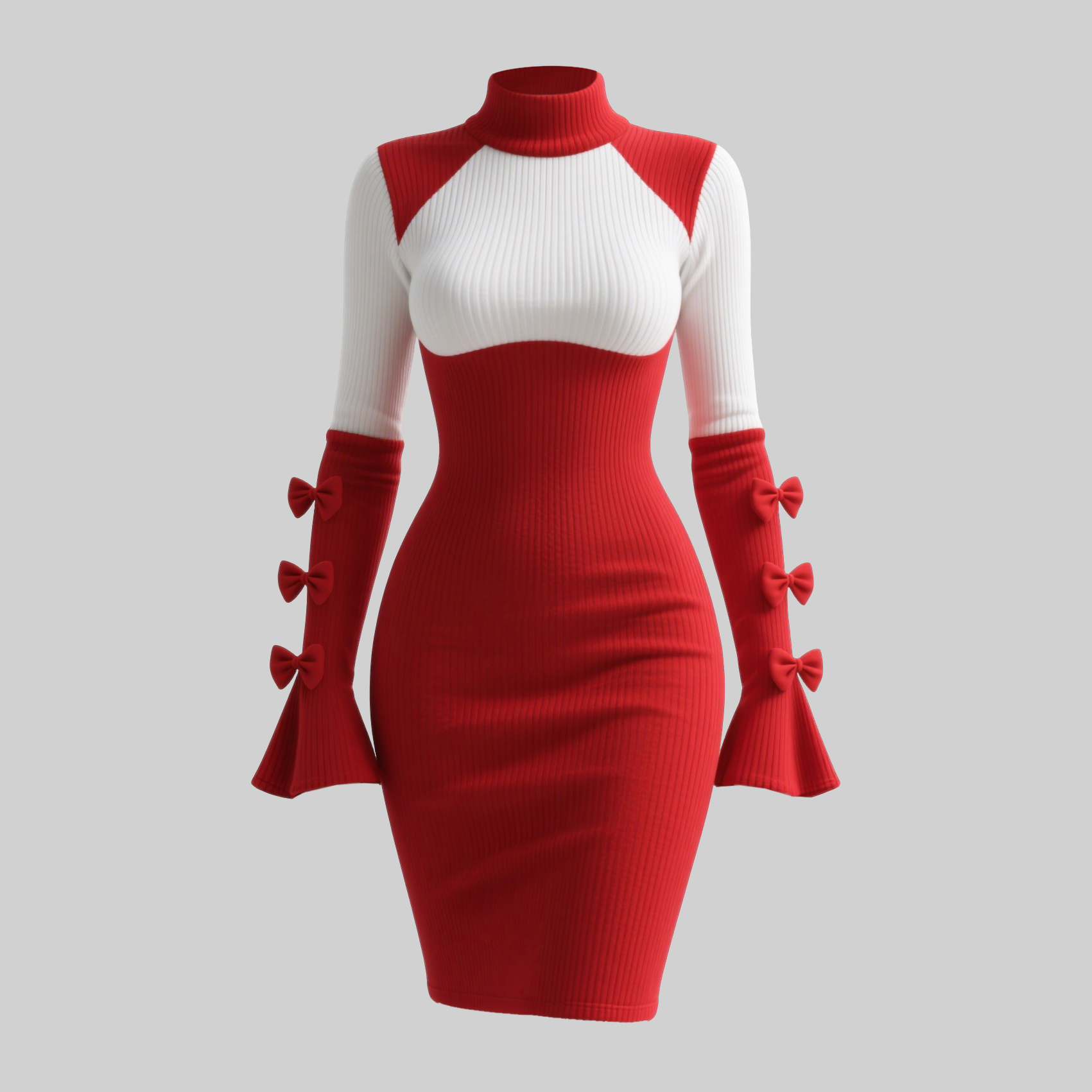 Women's Color-blocked Fitted High-neck Dress With Bow Embellishment, Sexy Flared Sleeves
