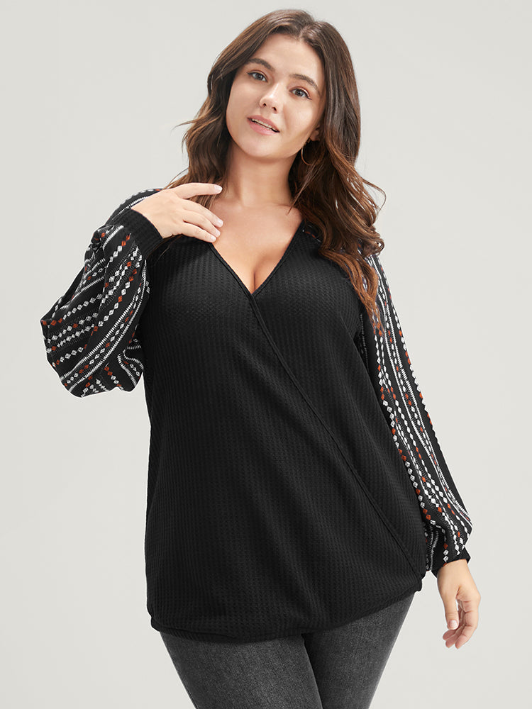 Solid Patchwork Striped Lantern Sleeve Waffle Knit Wrap Sweatshirt