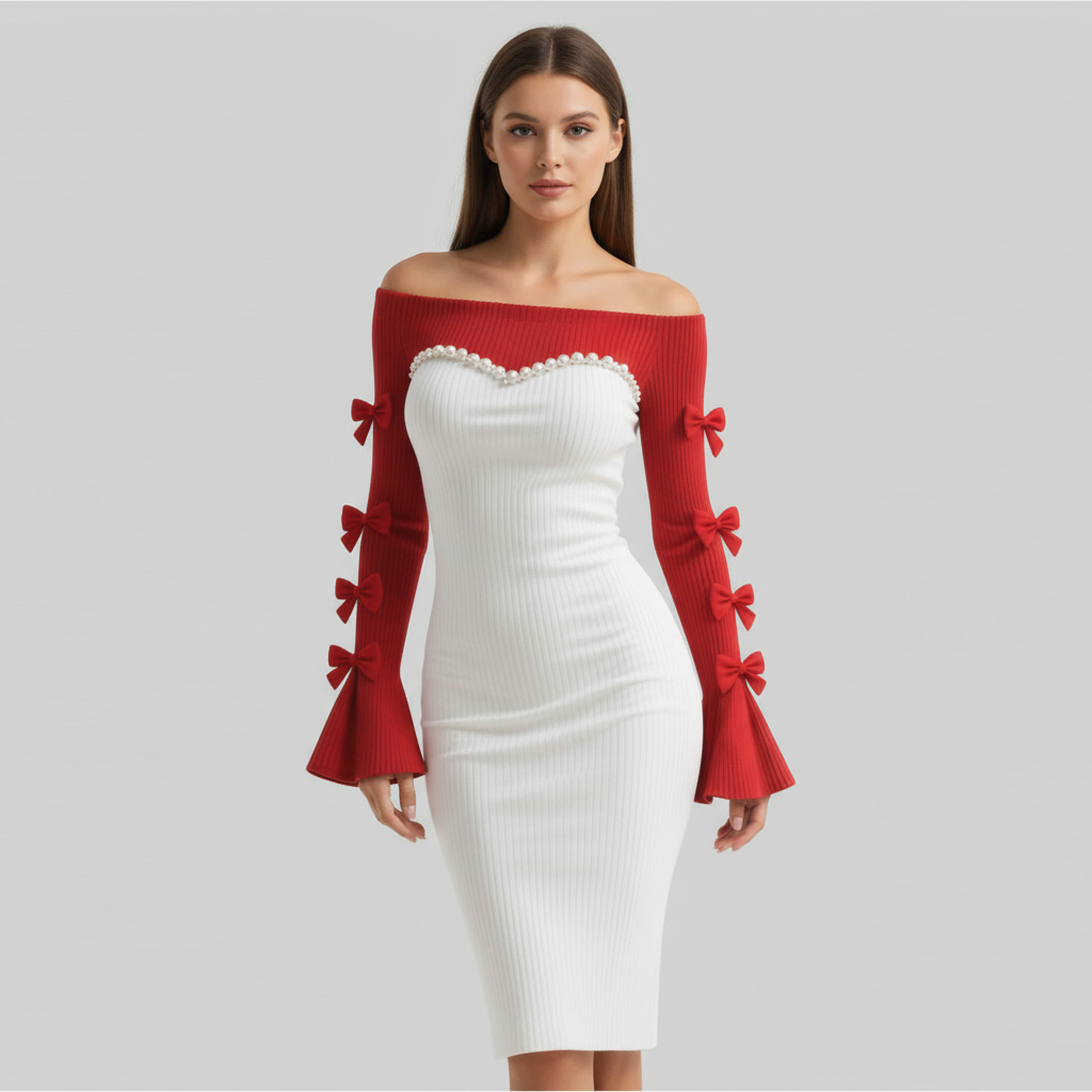 Women's Color-blocked Fitted Off-shoulder Dress With Bow And Pearl Embellishments, Sexy Flared Sleeves