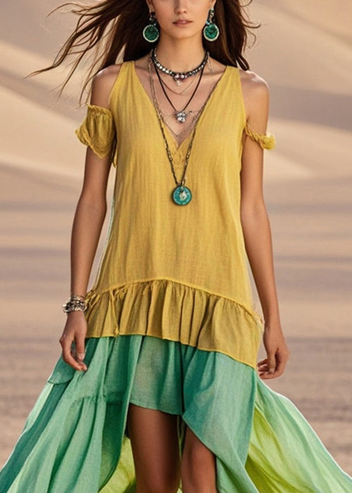Yellow Patchwork Cotton Maxi Dresses Cold Shoulder Asymmetrical Design Summer